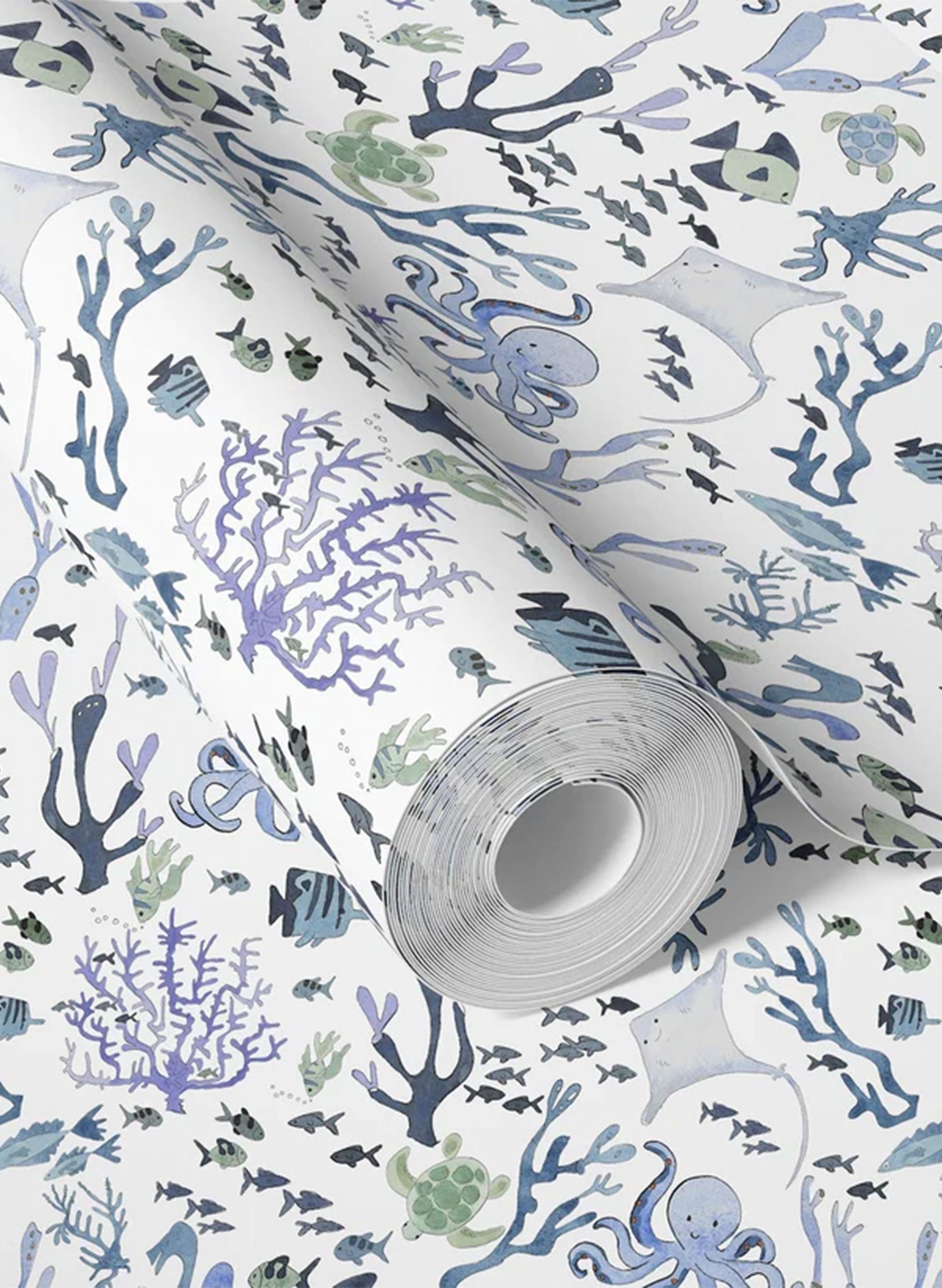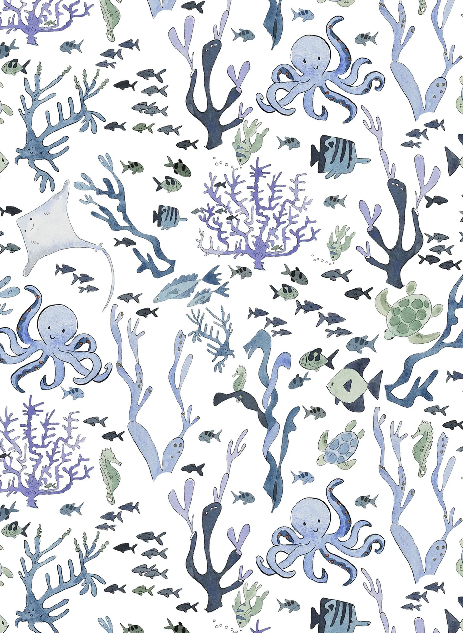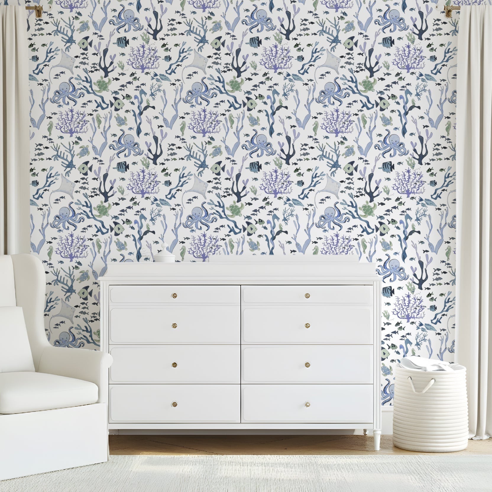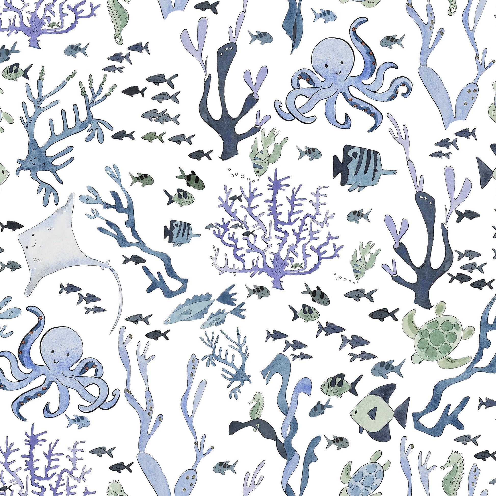 Transform a child's space with this elegant coral reef wallpaper, where watercolor sea life swims gracefully across sea-inspired colors. A versatile choice that matures beautifully as your child grows, blending imaginative appeal with understated style.