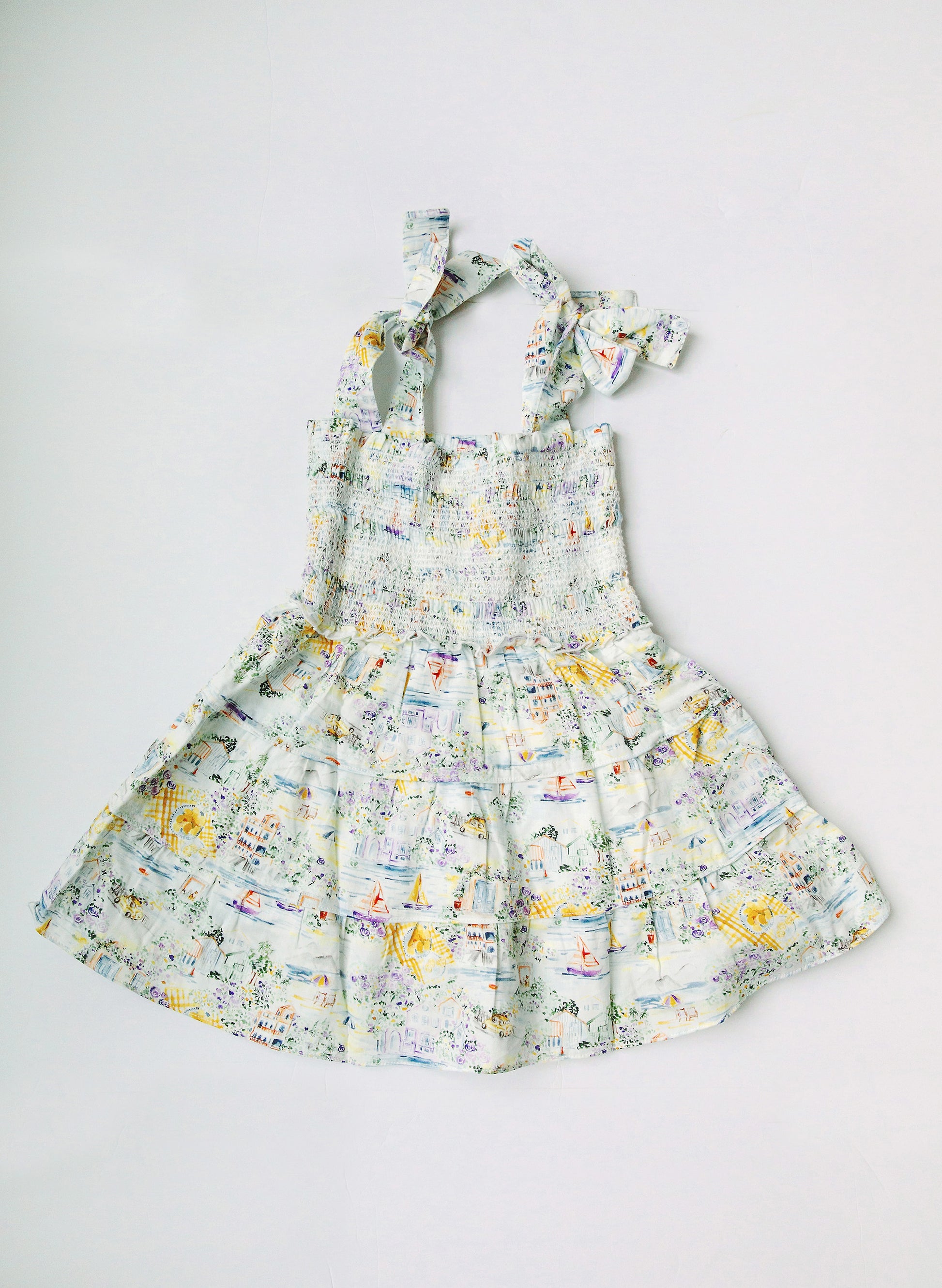 A relaxed take on a smocked silhouette with dreamy hand-painted lemon trees amidst various Amalfi Coast vignettes. Our Gemma dress is made of 100% GOTS certified organic cotton sateen in our newest Limoncello print.