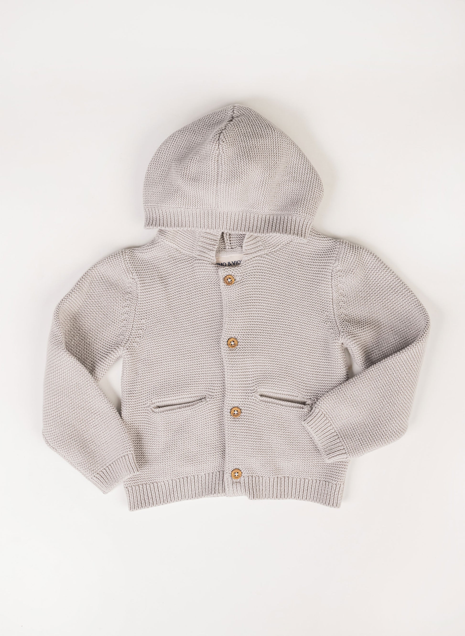 Perfect for everyday styling, the William Cardigan is a timeless layering piece crafted from the softest organic cotton knit in a versatile soft grey hue. With a cozy hood and refined simplicity, it brings effortless charm to your little one’s wardrobe.