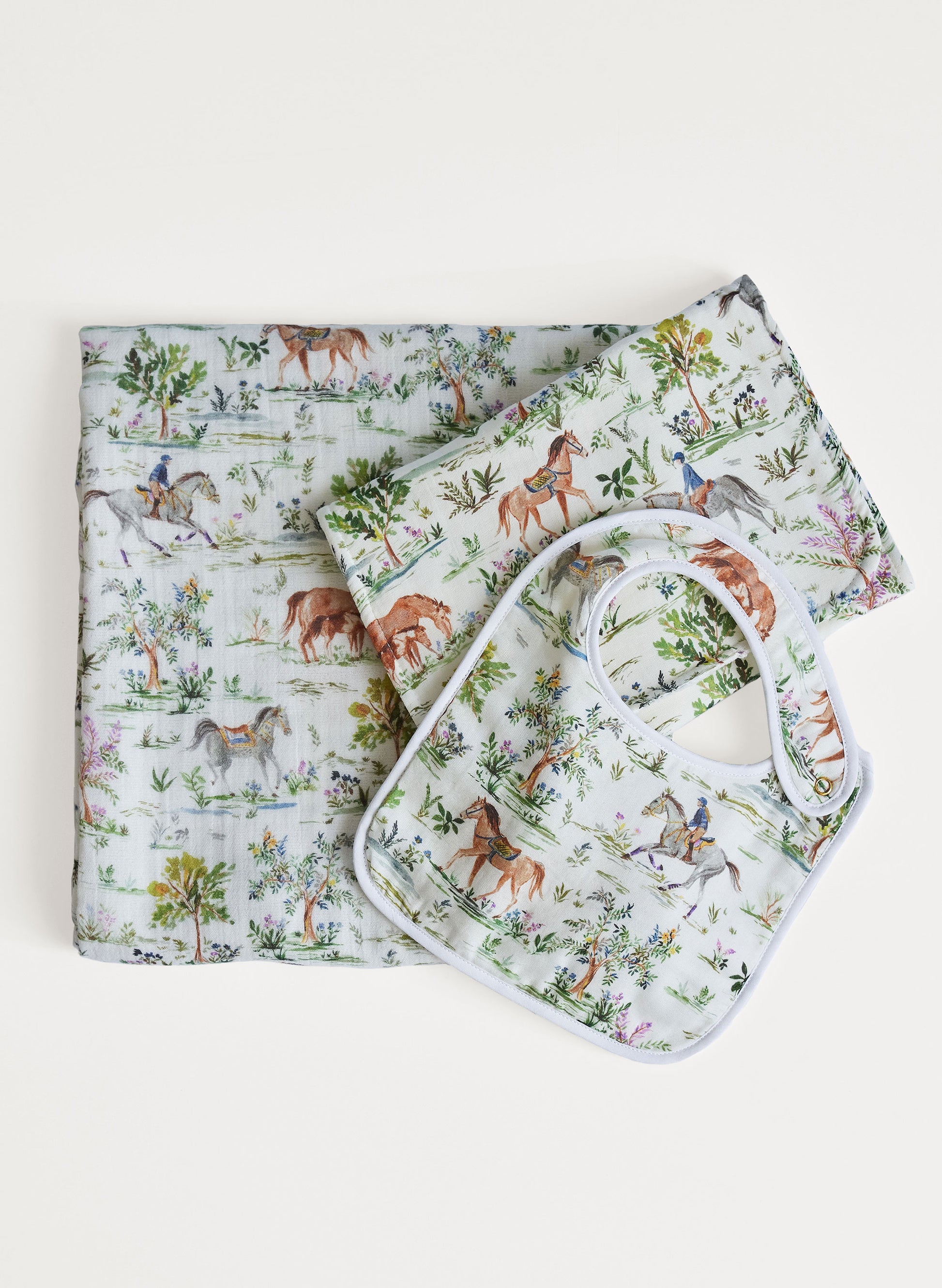 Something beautiful for mom and baby. Our Shawl Blanket, Perfect Bib and Burp Cloth, all in our Hunter Pace motif.