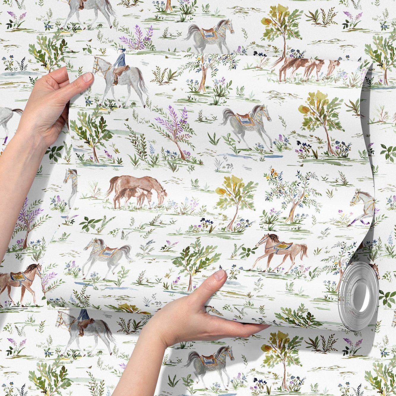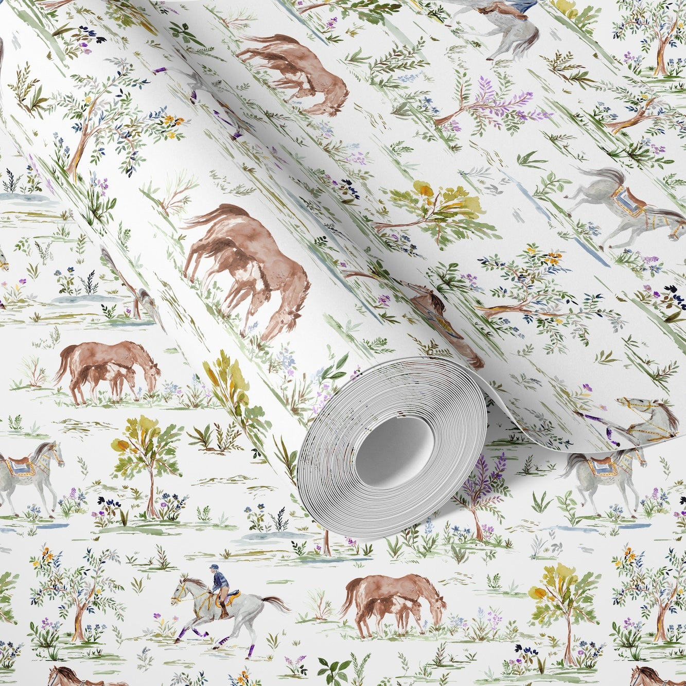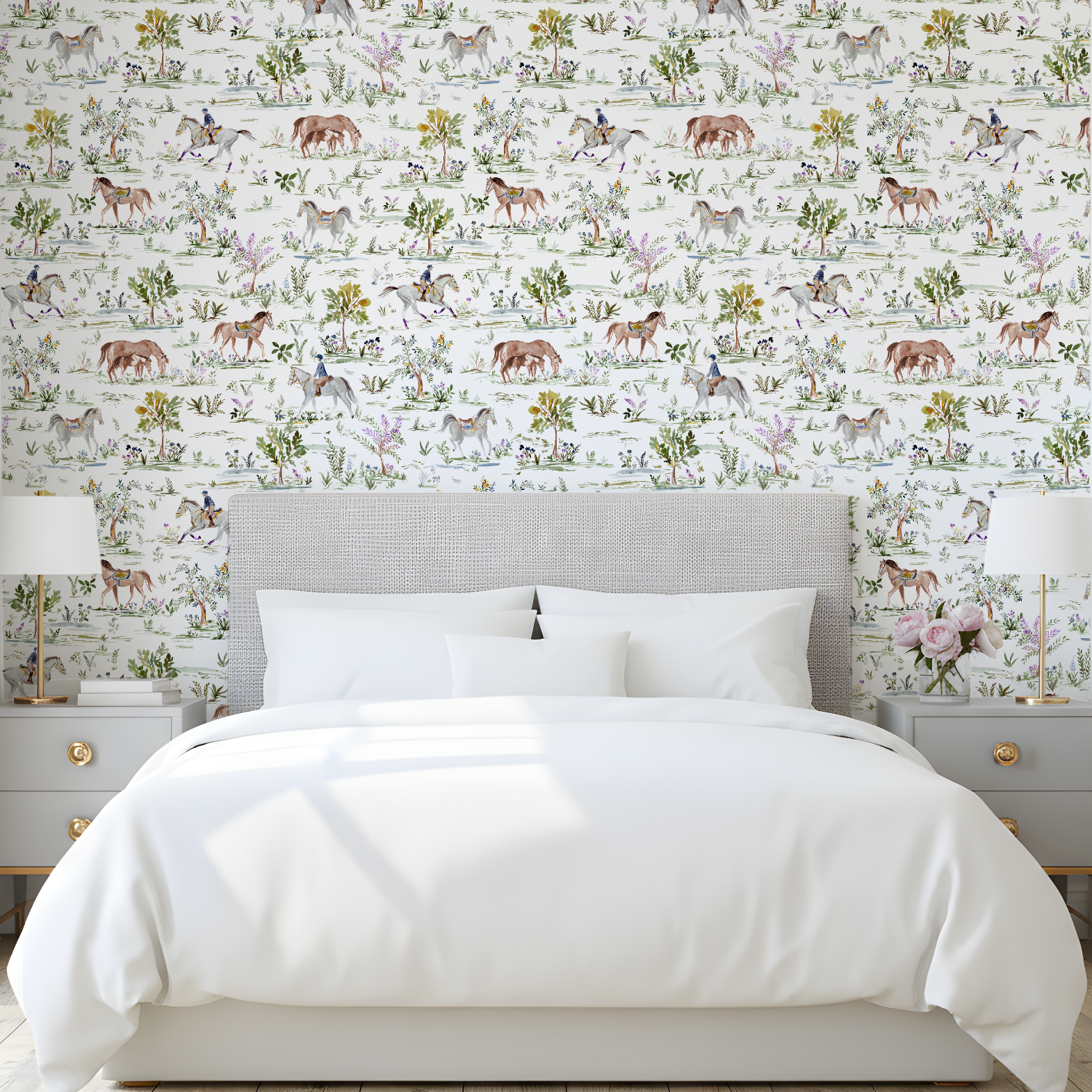 Hunter Pace, a signature Timo and Violet design, brings timeless elegance to any room with its sophisticated equestrian motif. Available in Premium Matte and Grasscloth finishes, each option delivers distinct tactile appeal.