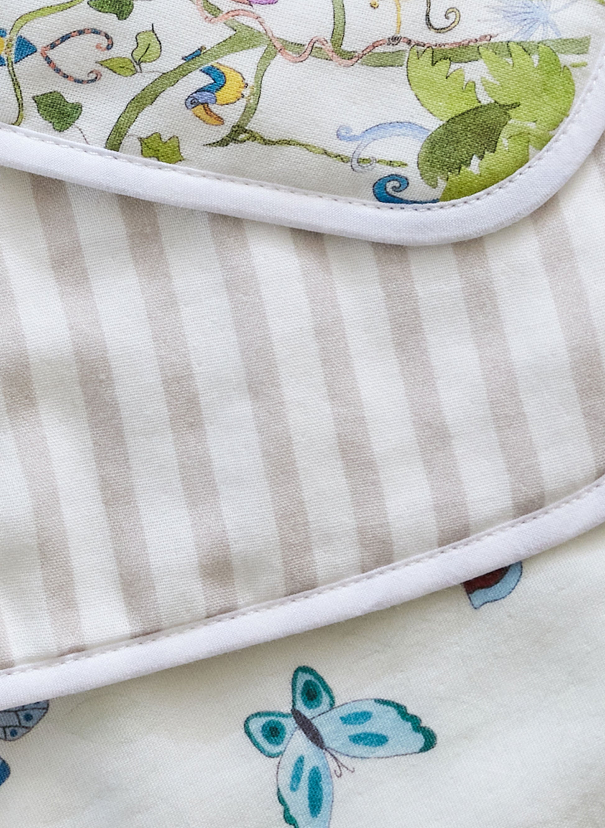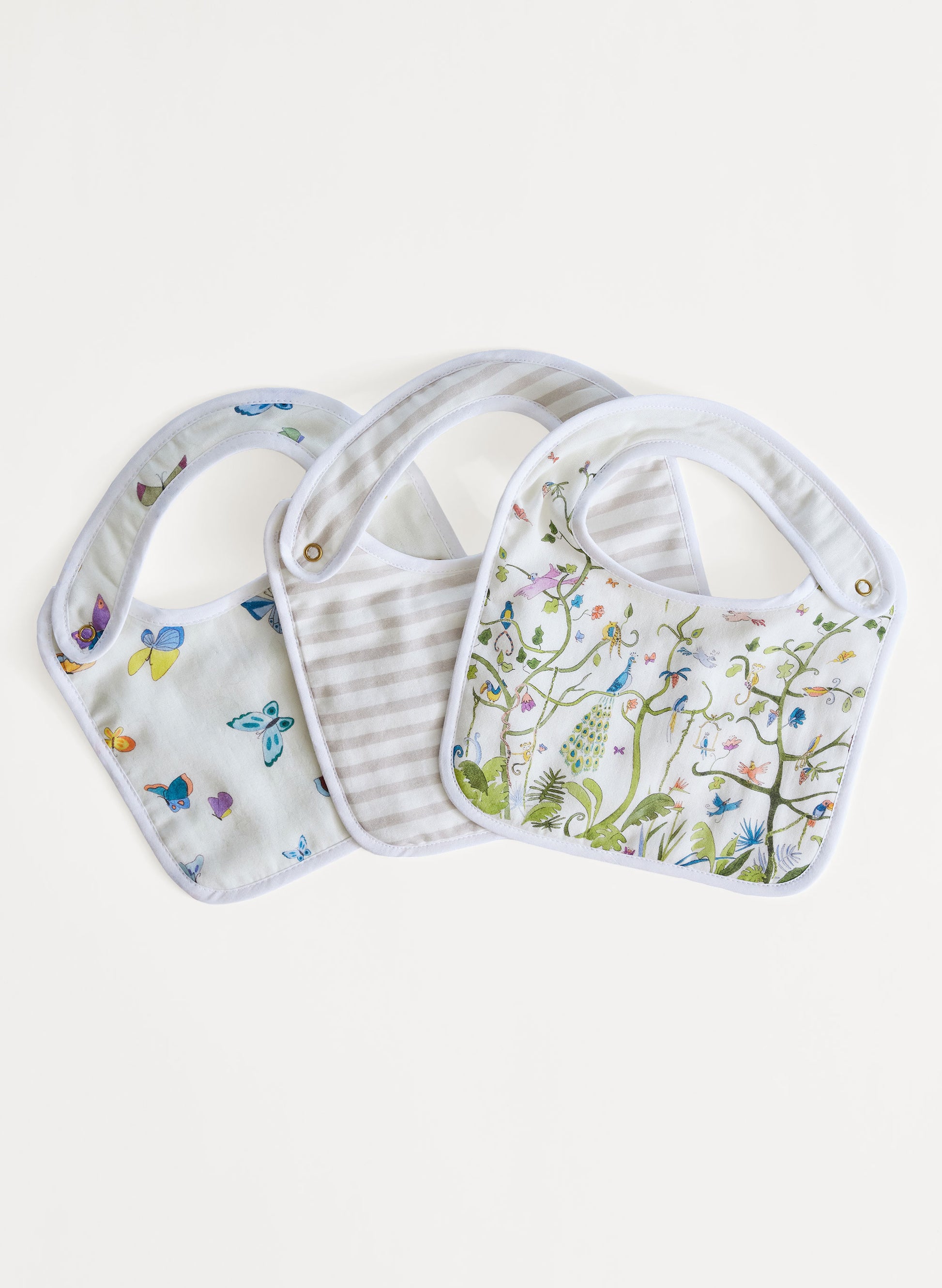 - Set includes Tropical Chinoiserie Bib, Madame Butterfly Bib, and Sand & White Striped Bib