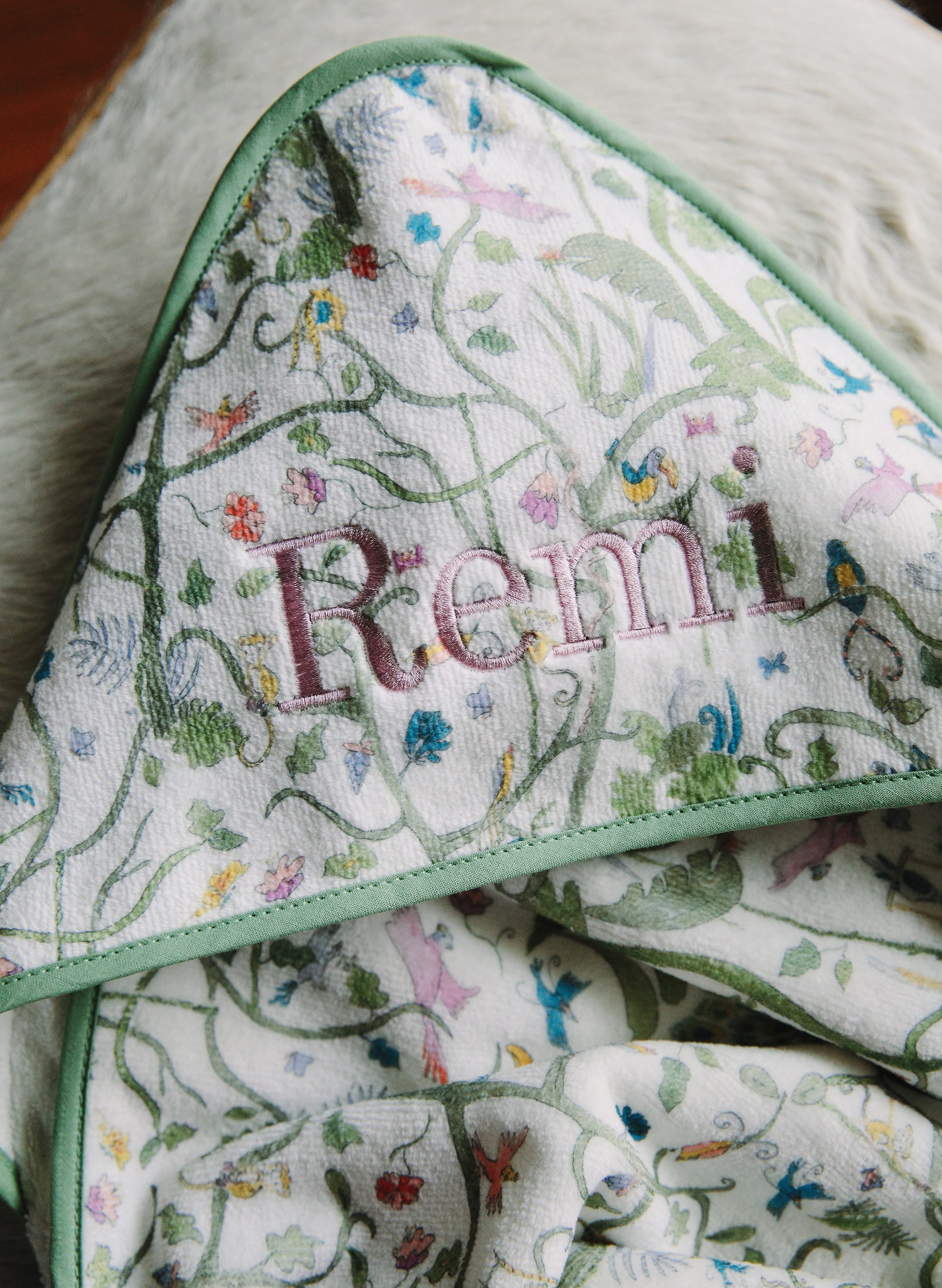 A larger towel with big personality in our Tropical Garden print, that can take your little one from infancy through 6 years old! "Fewer, better" is our motto. Use this printed towel after the bath or after a swim. Can be personalized too!