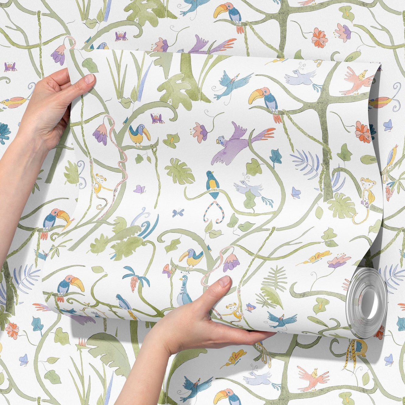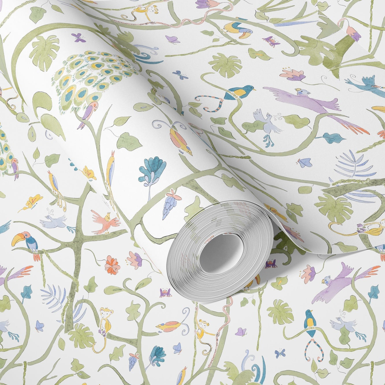 The Tropical Garden Wallpaper brings the wonder of nature indoors with its captivating composition of peacocks, toucans, and lush greenery. A timeless choice for rooms that celebrate curiosity, artistry, and the joy of discovery, available on our Premium Matte and Grasscloth paper.
