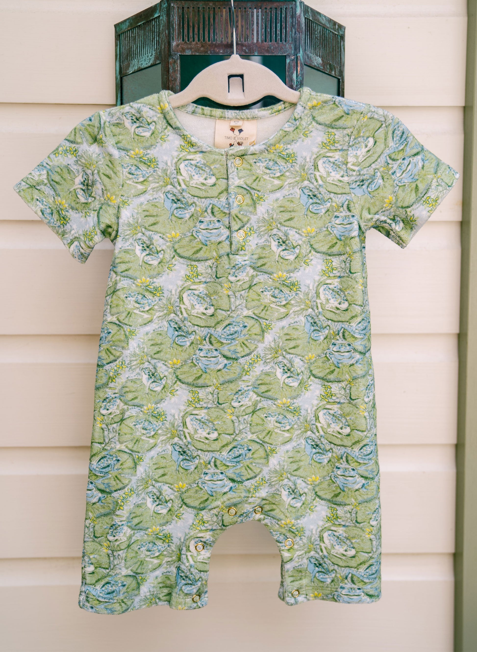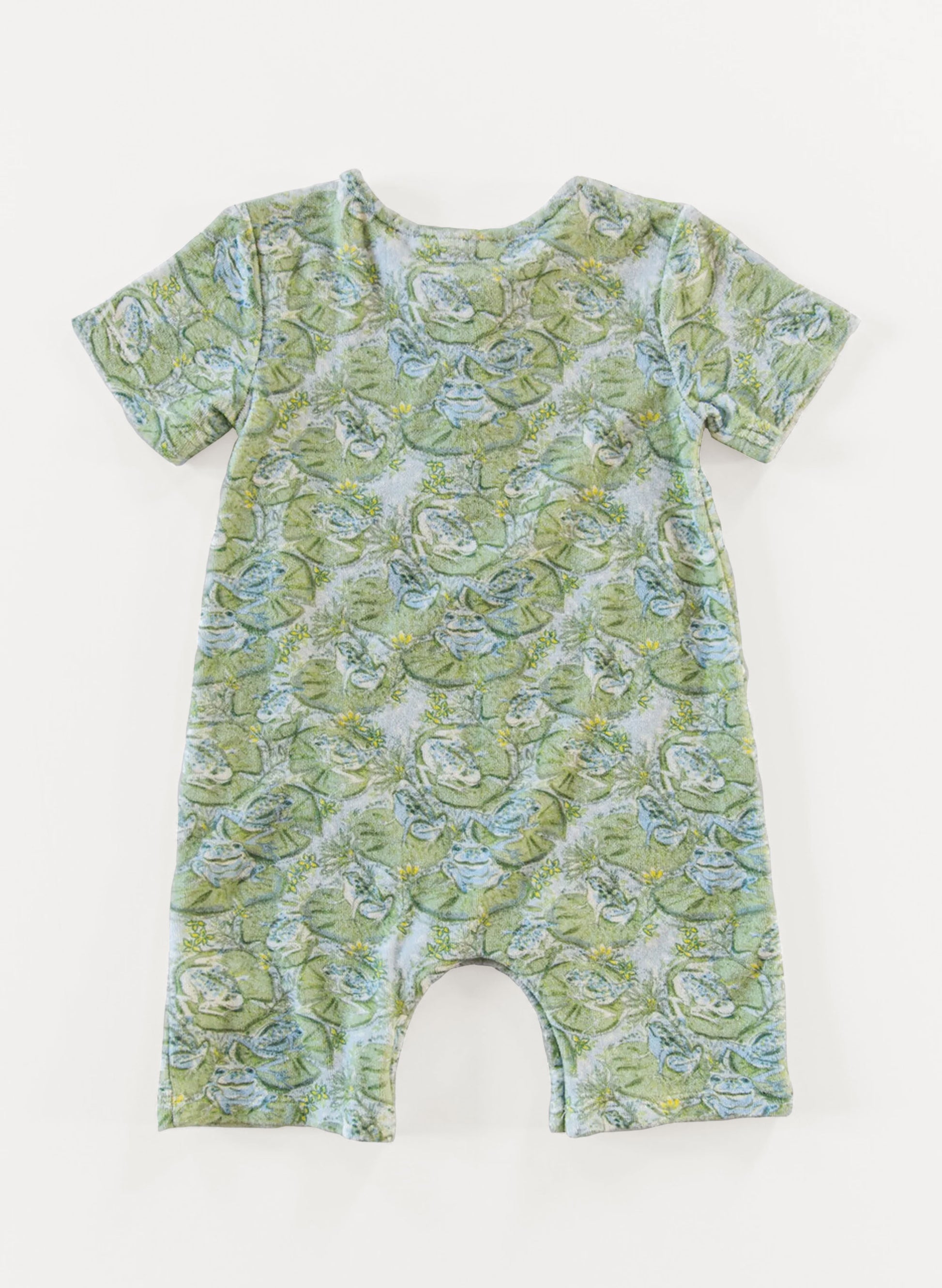 Hop into summer with our Walker terry romper! Made from 100% GOTS certified organic cotton terry, it's the perfect everyday piece in our playful Hoppy Place print of frogs and lily pads painted by Charleston-based artist, Ashley Begley. Comfortable, quick drying, and eco-friendly, your little one will feel extra happy, or "hoppy!"